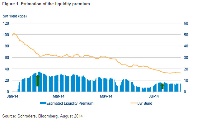 Figure 1 provides an estimate of the liquidity premium for bunds over the period. This is calculated by subtracting the yield on the bund from the agency bond. When there is demand for safe haven assets, the yield on the bund falls and the liquidity premium rises. Two such periods are highlighted in the chart, the first in February when investors became concerned about the impact of the crisis in Ukraine and the second in July when the Malaysian Airlines flight was shot down over Eastern Ukraine. However, despite these periods of heightened geopolitical tensions and risk aversion, the overall trend in 2014 has been a decline in the liquidity premium.
