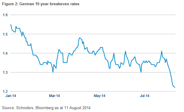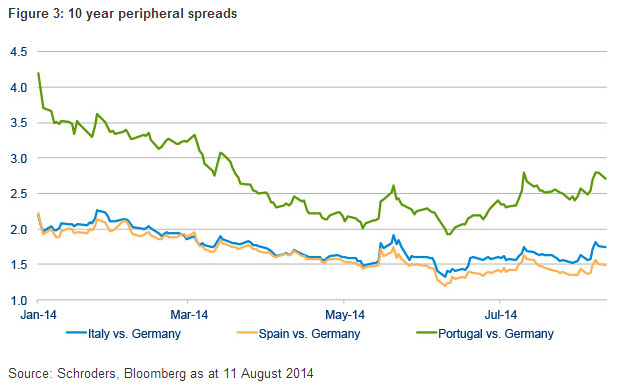 This suggests that concern over the European recovery and deflation played a more important role in the outperformance of bunds. Last week Mario Draghi, president of the European Central Bank (ECB), announced that the bank had “intensified preparatory work” on quantitative easing as a potential tool to fight deflation and the economic slowdown. However, markets were not convinced. The 10 year German breakeven rates (the difference between the yields of nominal and inflation-linked bonds) collapsed after Draghi’s speech (figure 2), while the spread between bund and periphery yields widened (figure 3).