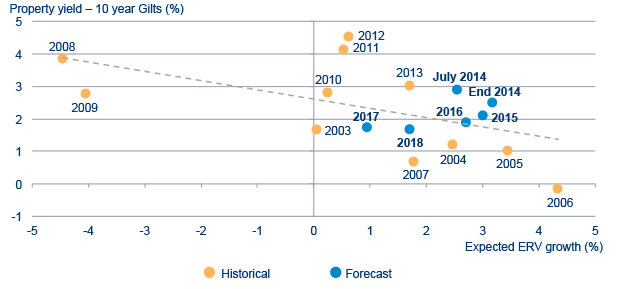 Our analysis suggests that even factoring in further yield compression in 2014 and 2015, given the simultaneous appreciation that is forecast in rental values, property will continue to look fairly priced.