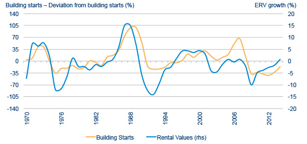 In this chart, history illustrates that the relationship between property yields and bond yields is weak. As mentioned, investors generally tolerate lower property yields in periods when rental values are strongly rising (typically when the economy is strong, interest rates and bond yields rise) and require higher yields when they are not (that is, when economies are weak and interest rates and bond yields falling). It shows that property looked expensively priced in 2006 notwithstanding strong rental growth, with average property yields below long-dated gilts. Despite the rapid re-pricing we saw in 2007 and 2008, the spread over gilts was still not sufficient to tempt investors back, largely because rents were still falling by approximately 4% per annum. Property prices started to look attractive in 2011/12 when rents started to stabilise and the spread over gilts rose to over 4%, more than twice the long-run average.