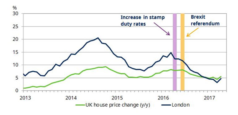 In the UK, house price growth began to slow noticeably last year when stamp duty on buy-to-let and second homes increased. The slowdown continued after the announcement that the UK would be leaving the EU. Perhaps surprisingly, London has been hit harder than the rest of the UK.