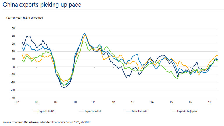 Exports to the US, Japan and Europe all accelerated in June (with a particularly strong pickup in the US). Although June exports to emerging markets were marginally softer, the overall growth trend for the global economy is encouraging.