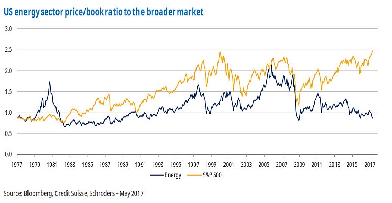 The valuation of the US energy sector has been falling. The price-to-book (P/B) ratio used in the chart below compares the sector's share price with the value of its assets (minus its liabilities). If a company has a P/B less than one, it could be undervalued compared to its assets.