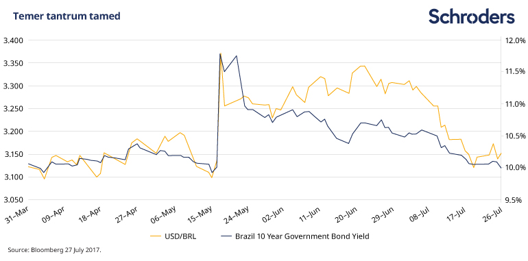 Yields on Brazilian government bonds declined and the real recovered against the US dollar in July. It follows a sharp increase in political risk in May, as allegations of corruption were levelled at President Temer.