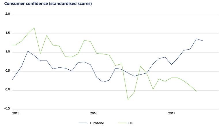 Consumer confidence readings in the UK and eurozone have diverged significantly since the start of this year. Confidence has been on the rise among eurozone consumers as economic data in the single currency area has been encouraging and unemployment is falling. Perhaps most importantly, political risk has eased considerably with Emmanuel Macron’s victory in the French elections.