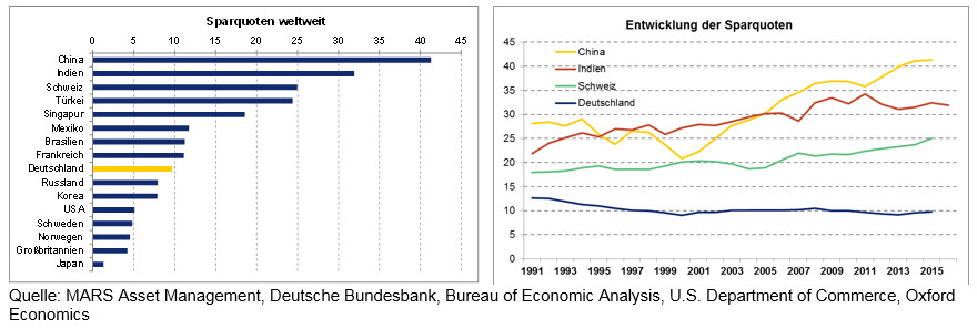 Deutsche Haushalte sparen rund 10% ihres verfügbaren Einkommens (linke Grafik). Das ist im internationalen Vergleich ein durchschnittlicher Wert. Die angelsächsischen und skandinavischen Länder sparen im Verhältnis zum Einkommen weniger – viele Schwellenländer dagegen sind bienenfleißige Sparer. Die höchsten Sparquoten haben China (41%), Indien (32%) und die Schweiz (25%). In den letzten 25 Jahren hat sich die deutsche Sparquote kaum verändert, während andere Länder (vor allem China und Indien) deutlich zulegen konnten (rechte Grafik).