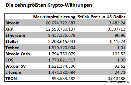 Ein Blick auf die Webseite coinmarketcap.com offenbart, dass es derzeit über zweitausend Krypto-Währungen gibt. Es ist müßig, sich mit jeder einzelnen zu befassen. Schließlich überleben Währungen langfristig nur dann, wenn möglichst viele Menschen daran glauben, dass sie einen mindestens stabilen Wert haben, den auch andere Marktteilnehmer ihnen beimessen. Ein Blick auf die wichtigsten Krypto-Währungen mit dem höchsten Gesamtwert ist aber aufschlussreich. Die Erkenntnis: Der Bitcoin ist trotz enormen Wertverlustes mit einem Gesamtwert von etwas über 60 Milliarden US-Dollar immer noch die mit Abstand wichtigste Krypto-Währung.