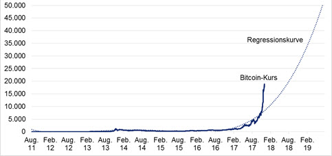 Das Wachstum des Bitcoins wird schnell als "exponentiell" beschrieben. Auf der Suche nach einer passenden Formel, die den Kursverlauf des Bitcoins seit 2011 gerecht wird, musste schon auf ein Polynom vierten Grades zurückgegriffen werden. (Die genaue Formel: Bitcoin-Kurs = 1,9E-08x4 - 5,4E-05x3 +0,048x2 -14x +885) Mit dieser Wachstumsgeschwindigkeit würde der Preis eines Bitcoins in zwei Jahren bei ca. 50.000 USD liegen.