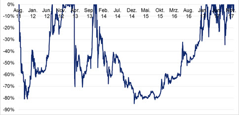 Die Kursrückschläge von vorhergehenden Hochs betrugen über 80%. Das heißt, ein Pechvogel mit einem schlechten Ein- und Ausstiegszeitpunkt hätte trotz „Kursfeuerwerk“ einen beinahe Totalverlust mit dem Bitcoin erlitten.