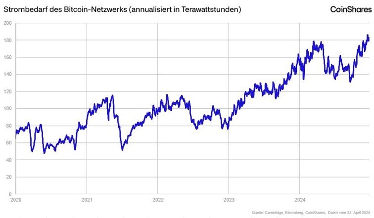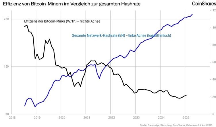 Entgegen verbreiteten Annahmen führen schnelle Zuwächse bei der Rechenleistung (Hashrate) nicht automatisch zu einem gleich hohen Anstieg des Energieverbrauchs. Dank technologischer Fortschritte ist der Stromverbrauch im Vergleich nur moderat gestiegen.
