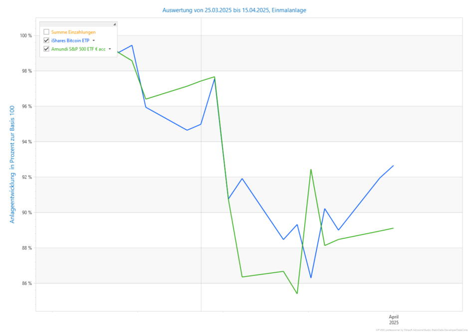 Seit dem „Liberation Day“ am 2. April, an dem wirtschaftlich schädliche Handelszölle angekündigt wurden, fiel der S&P 500 um etwa drei Prozent, während der Bitcoin sogar leicht zulegte. Zudem stieg die Volatilität an den Aktienmärkten stärker als beim Bitcoin, dessen Schwankungen aktuell abnehmen.