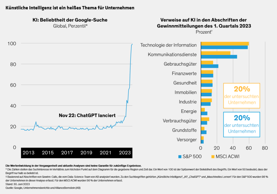 Der Wirbel um die bahnbrechenden Fähigkeiten der generativen KI hat explosionsartig zugenommen. Seit dem Start von ChatGPT ist die Beliebtheit von Künstlicher Intelligenz bei Google sprunghaft angestiegen (Abbildung links). Jeder spielt mit Chatbots, aber Künstliche Intelligenz ist nicht nur zur Unterhaltung gedacht. Fragt man ChatGPT, wie KI die Wirtschaft verändern könnte, spuckt es eine Liste von Anwendungen aus, die von virtuellen Assistenten für den Kundensupport über prädiktive Analysen und Betrugserkennung bis hin zu futuristischen autonomen Fahrzeugen und Drohnen reicht.