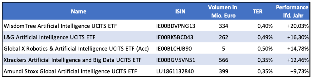 Der Amundi Stoxx Global Artificial Intelligence ETF bildet den gleichnamigen STOXX-Index ab. Der breit gestreute Index bietet für Jeden etwas. Neben Werten wie den Healthcare-Spezialisten Align-Tech und Alphatech finden sich auch Aktein von Unternehmen wie Warner Brothers oder Maxar wieder. KI ist eben kein leicht einzugrenzendes Thema.