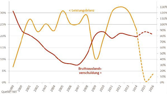 Leistungsbilanz (in % des BIP, linke Skala) und Bruttoauslandsverschuldung (in % des BIP, rechte Skala)