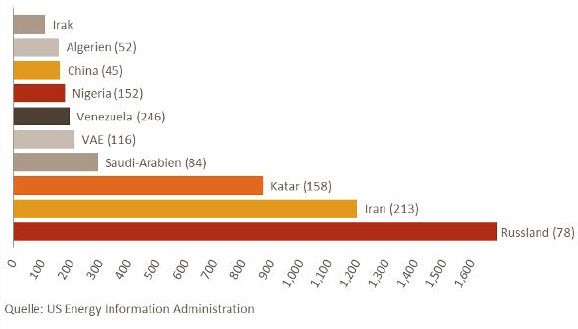 Nachgewiesene Erdgasreserven im Jahr 2015: Top-10-Staaten