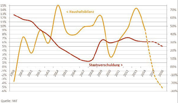 Haushaltsbilanz (in % des BIP, linke Skala) und Staatsverschuldung (In % des BIP, rechte Skala)