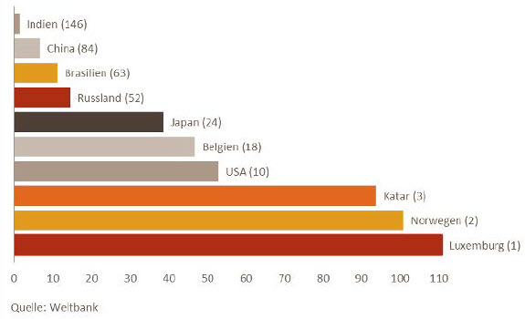 Tausend US-Dollar (horizontale Achse) und Position auf Rangliste mit 185 Staaten (in Klammern)