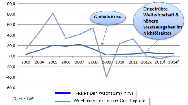 Die Ölpreise sorgten derzeit auch für einen Leistungsbilanzüberschuss des Landes, da beides eng miteinander verknüpft sei. Seit dem Jahr 2005 bewege sich der Überschuss im Verhältnis zum BIP im zweistelligen Bereich. Im Krisenjahr 2009 wurde der Quotient einstellig. „2012 und 2013 wird der Leistungsbilanzüberschuss auf jeweils 7,4 Prozent bzw. 4,4 Prozent des BIP geschätzt, und die Zahlungsbilanz dürfte den weiteren Aufbau des Finanzpolsters erlauben“, so Witte. Allerdings ist Angolas Exportbasis sehr einseitig. Erdölexporte sorgten für 96,8 Prozent der gesamten Deviseneinnahmen, was das Land ebenfalls anfällig macht für externe Schocks. „Die Leistungsbilanz dürfte sich in den nächsten Jahren verschlechtern und ab 2016 ein Defizit aufweisen, da die öffentlichen Investitionen hohe Importe nach sich ziehen und die Ölpreise sich auf niedrigem Niveaus bewegen“, prophezeit Witte. Die fehlende Exportdiversifizierung stelle ein strukturelles wirtschaftliches Risiko dar, denn die Exporte anderer Branchen mit hohem Potenzial (Bergbau, verarbeitende Industrie, Landwirtschaft) entwickelten sich nur schwach. Witte führt das auf die negativen Folgen von Ressourcenreichtum zurück.