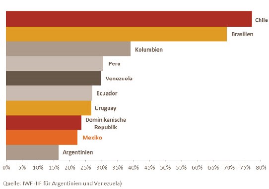 Das Land verfüge zwar über einen soliden Rechts- und Aufsichtsrahmen, der die innere Stabilität fördere. Dennoch bleibe die Risikoaversion der Geldgeber trotz angemessener Vorkehrungen und stabilisierter Kreditausfallraten weiterhin relativ hoch. „Das Kreditvolumen mexikanischer Banken liegt bei nur 22 Prozent des BIP, weniger als ein Drittel der Werte für Brasilien und Chile“, kritisiert der Experte. „Daher die Reformen, um den Zugang zu Krediten zu erleichtern: mehr Wettbewerb der privaten Banken soll Zinsen senken; Entwicklungsbanken sollen animiert werden, aktiver Kredite zu vergeben; eine erleichterte Beschlagnahmung der Vermögenswerte von Unternehmen, die ihren Rückzahlungspflichten nicht nachkommen, soll die Risikobereitschaft erhöhen.“ Ob diese Reformen erfolgreich sind, dürfte zum großen Teil davon abhängen, inwieweit die Vorteile der Finanzdienstleistungen auf die umfangreiche informelle Wirtschaft ausgedehnt werden.