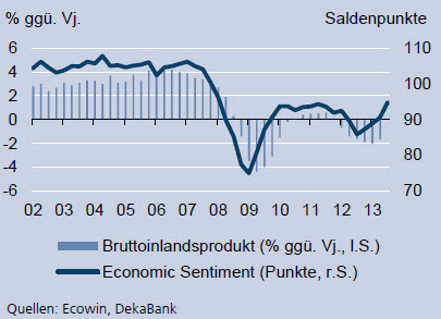 „Das spanische Wirtschaftsmodell musste einer Generalüberholung unterzogen werden“, sagt Scheuerle. „Weg vom binnenorientieren Wachstum, hin zu einer Stärkung der außenwirtschaftlichen Flanke.“ Das bedeutete unter anderem, dass für Lohnzuwächse auch perspektivisch nur geringe Spielräume vorliegen. Und auch von fiskalpolitischer Seite war nicht viel zu erwarten, da der Staat seine Defizite in den Griff bekommen musste. „Der mittelfristige Ausblick für Spanien bleibt gedämpft“, meint Scheuerle daher. „Für dieses Jahr rechnen wir mit einer Schrumpfung des BIP um 1,3 Prozent.“ Doch 2014 könnte es erstmals seit Langem wieder ein sehr bescheidenes Wachstum von 0,4 Prozent geben. „Die Erholung dürfte sich zwar in den kommenden Jahren fortsetzen, doch die nur langsam sinkende Arbeitslosigkeit, die Notwendigkeit weiterer Konsolidierungsmaßnahmen und die Anfälligkeit der privaten Haushalte gegenüber Zinserhöhungen begrenzen das Wachstum merklich“, analysiert Scheuerle.