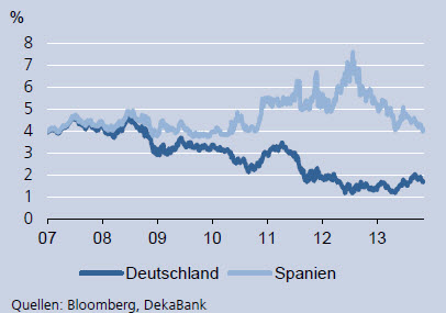 Dass Spanien in den vergangenen Jahren einer der Brennpunkte der europäischen Staatsschulden- und Finanzkrise war, äußerte sich auch in den Renditen der Staatsanleihen. „Zwischenzeitlich verzeichneten sie Risikoprämien gegenüber deutschen Bundesanleihen von über 600 Basispunkten“, fügt Tödtmann an. Eine Erleichterung trat erst im Sommer 2012 ein, als die Europäische Zentralbank (EZB) das Staatsanleiheankaufprogramm ankündigte. Auch wenn es bisher noch nicht aktiviert wurde, so habe es doch bei den Anlegern die Sorge gelindert, dass Spanien die Währungsunion freiwillig verlassen könnte, um anschließend durch die Abwertung einer neuen Währung fiskalische und wirtschaftliche Probleme zu überwinden. „In den vergangenen Monaten haben Anzeichen für ein baldiges Ende der Rezession zu einer weiteren Einengung der Risikoprämien beigetragen“, erkennt Tödtmann. „Anleger gehen davon aus, dass es der spanischen Regierung bei einem wieder positiven Wirtschaftswachstum eher gelingen wird, die Staatsfinanzen auf einen nachhaltigen Pfad zu bringen.“ Auf diese Weise habe sich das Land dem globalen Anstieg der Marktzinsen weitgehend entziehen können.
