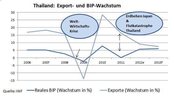 Wittes Ausblick für die thailändische Wirtschaft ist „vorsichtig positiv“. 2011 sei das Land mit einem Wachstum von 0,1 Prozent nur knapp an der Rezession vorbeigeschrammt, was er insbesondere auf heftige Überschwemmungen zurückführt. Die darauf folgenden Ausgaben für den Wiederaufbau hätten die Konjunktur jedoch stimuliert. „Der Tourismus, die zweitwichtigste Devisenquelle des Landes, hat sich schnell erholt; die Beruhigung der politische Lage sorgte für einen Anstieg der Touristenzahlen auf Rekordniveau“, so der Experte. Mit der Rückkehr des Vertrauens flossen auch die ausländischen Direktinvestitionen wieder und setzten ihren Aufwärtstrend fort. Im vergangenen Jahr sei das Wachstum des Bruttoinlandsprodukts (BIP) um etwa 5,5 Prozent gewachsen. Durch einen steigenden Abnehmeranteil aufstrebender Entwicklungsländer konnten zudem die enttäuschenden Exportergebnisse abgemildert werden.