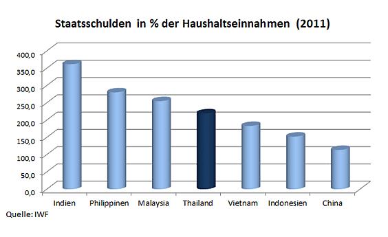 Die Situation um Thailands Staatsfinanzen habe sich hingegen entspannt, auch wenn sie sich seit der globalen Krise 2008/2009 verschlechtert hat. „Die Regierung fährt einen expansiven Kurs: sie hat die Wiederaufbauarbeiten finanziert, eine Reihe von Maßnahmen zur Verbesserung der Einkommen umgesetzt und die Unternehmenssteuersätze gesenkt“, so der Autor. Die älter werdende Bevölkerung des knapp 68 Millionen Einwohner großen Landes sorge jedoch für steigende Kosten und höhere Ausgaben. „Angesichts des starken Zuwachses der Staatsausgaben bei gleichzeitig unzureichenden und sinkenden Einnahmen ist das Haushaltsdefizit inzwischen zur Regel geworden“, sagt Witte. In Zukunft erwartet er ein jährliches Defizit von drei bis vier Prozent des BIP. Die Staatsschulden würden mittelfristig langsam von derzeit 45 Prozent des BIP auf 50 Prozent ansteigen, womit sie nicht weit über dem regionalen Durchschnitt lägen. Die Auslandsschuldenquote hingegen ist die niedrigste in ganz Asien: „Seit der Asienkrise 1998 sind die Auslandsschuldenquoten stetig gesunken – mit Ausnahme von 2009/2010, als sie kurzfristig wieder anstiegen“, erläutert Witte. Derzeit lägen sie bei 25 Prozent des Niveaus von 1998. Im vergangenen Jahr sei sie unter 30 Prozent des BIP geblieben und habe lediglich 35 Prozent der Exporterlöse betragen. „Diese Quoten dürften sich unter Annahme eines andauernden Wachstums wie bisher weiter zurückbilden“, erwartet Witte.