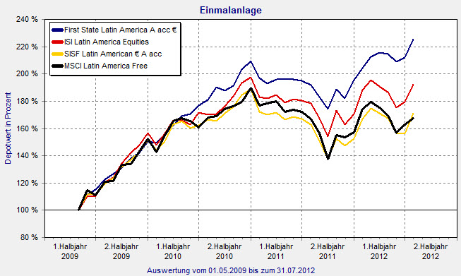 Die größte Wertentwicklung in den vergangenen drei Jahren erzielte der €uro-FondsNote-2-Fonds First State Latin America mit einem Plus von 83,88 Prozent. Die Fondsmanager verwalten in dem im April 2009 aufgelegten Fonds ein Volumen von 175 Millionen Euro. Mit einer Volatilität von nur zwölf Prozent ist das First-State-Produkt deutlich risikoärmer als der Index. Auch der DAX kommt da nicht ran. Die Sharpe Ratio von 1,77 ist hervorragend. Mit einer TER von 2,05 Prozent liegen die Fondsmanager im Mittelfeld der Fonds aus Südamerika. Die Länderallokation zeigt auch hier eine hohe Gewichtung Brasiliens (36,7 Prozent). Ähnlich stark, mit 36,1 Prozent, ist der Fonds in Chile investiert. Mexiko macht einen Anteil von 19,5 Prozent aus (Stand: 31. Mai 2012). Nichtzyklische Konsumgüter stellen mit auf Sektorebene mit 30,0 Prozent den größten Anteil. Versorger (16,2 Prozent) und Finanzen (14,0 Prozent) sind ebenfalls stark vertreten. Die größten Einzeltitel sind mit 8,1 Prozent der brasilianische Energiekonzern Tractebel Energia und mit 8,0 Prozent der chilenische Getränkehersteller Compania Cervecerias.