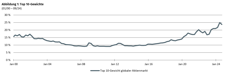 Auch im historischen Kontext hat die Dominanz der Mega Caps ein nie dagewesenes Rekordniveau erreicht: Dass die zehn größten Aktien weltweit, darunter Unternehmen wie Apple, Microsoft oder auch Nvidia, 25 Prozent des globalen Indexgewichtes vereinen, übertrifft selbst die Niveaus, welche man zuletzt zu Zeiten der Dotcom-Blase beobachtet hat. Die aktuelle Konzentration ist allerdings ein Resultat der starken Performance der Mega Caps über die letzten Jahre. Im Umkehrschluss erzielte der globale Aktienindex ohne Top 10-Titel im Jahr 2023 eine um 5,4 Prozent niedrigere Rendite. Der idiosynkratische Beitrag zu Performance und Risikostruktur des Index ist daher bedeutend und schwer zu ignorieren.