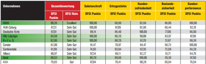 In Punkto Kundenperformance erzielten 29 Service-Versicherer eine exzellente Wertung. Ganz oben platzierte die Barmenia, vor der Basler DFD und Condor. Dennoch reicht es für keinen der genannten im Gesamtergebnis für einen Platz unter den Top-Fünf. Am besten schneidet hier der die Münchener WWK Versicherung ab, die als einziger Anbieter ein Top-Ranking erzielt.