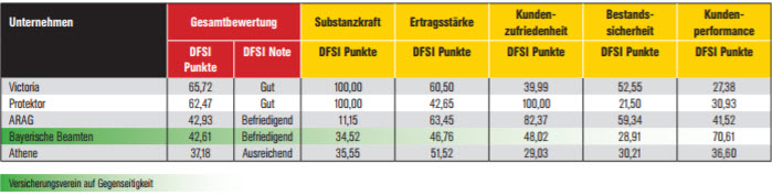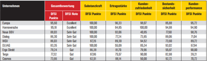 Dazu prüfte die DFSI die 70 größten Anbieter von Lebensversicherungen am Markt. Sie unterteilte die Unternehmen in drei Sparten: erstens Service-Versicherer mit eigenem Außendienst, zweitens Direkt- und Biometrieversicherer, die gegenüber den Service-Versicherern eine schlankere Kostenstruktur aufweisen, sowie drittens Versicherer, die ihr Neugeschäft eingestellt haben, sogenannte Run-Offs. Fünf Bereiche nahm das DFSI genauer unter die Lupe: die Substanzkraft (Finanzkraft bereinigt um die SCR-Quote), die Ertragsstärke (Überschussmargen, Nettoverzinsung sowie Verwaltungskosten), die Kundenzufriedenheit (Frühstorno- und Bafin-Beschwerdequoten), die Bestandssicherheit (Vertragsanzahl, Bestandswachstum, Spätstornoquote) sowie die Kundenperformance (Partitionsquote). Zur Ermittlung des Gesamtergebnisses wurden die Bereiche gewichtet. Am meisten Wert legten die Kölner zur Ermittlung der Zukunftsfähigkeit auf die aktuelle Wirtschaftskraft (Substanzkraft 35%, Bestandssicherheit und Ertragsstärke je 20%) der Unternehmen. Die Kundenperformance und –zufriedenheit, immerhin ein Indikator für eine zukünftig gute Wirtschaftslage, bekamen weniger Gewicht (15% bzw. 10%).