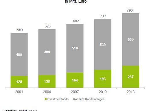 Wie der BVI auf Basis von Daten der Bundesanstalt für Finanzdienstleistungsaufsicht (BaFin) ausgewertet hat, steigerte sich das Anlagevolumen der Lebensversicherer in Investmentfonds von 2001 bis 2013 von 128 Milliarden Euro auf 237 Milliarden Euro. Der Anteil an den Kapitalanlagen der Lebensversicherer steigt damit von 22 auf 30 Prozent.