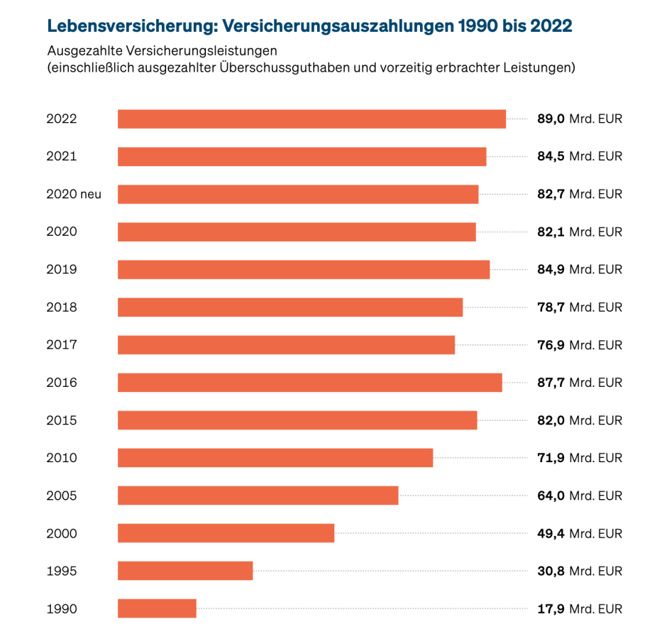 Dem gegenüber stehen seit 2020 steigende Auszahlungen der Lebensversicherungen. Lagen die ausgezahlten Versicherungsleistungen einschließlich ausgezahlter Überschussguthaben und vorzeitig erbrachter Leistungen 2020 bei 82,7 Milliarden Euro, so stiegen diese 2021 auf 84,5 Milliarden Euro und 2022 auf 89 Milliarden Euro (siehe Grafik). Aktuelle Auszahlungswerte für 2023 hat der GDV in seiner Jahrespressekonferenz Ende Januar 2024 noch nicht veröffentlicht.