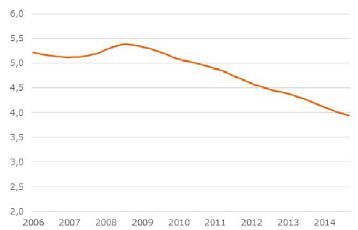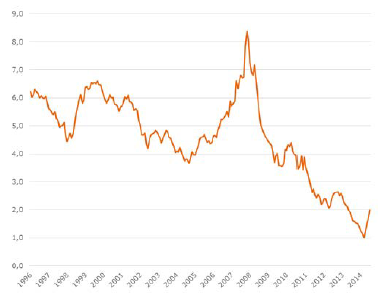 Ausgangpunkt für den stetigen Rückgang der Buchrenditen ist die Entwicklung des Zinsniveaus am Kapitalmarkt. Nach einem krisenbedingten Höchststand der Wiederanlagerendite von über 8% folgte ein rapider Absturz auf etwa 1% im ersten Quartal 2015 (siehe Grafik 2). Im Vergleich zu der Zeit vor der Finanzkrise ist der laufende Ertrag für Wiederanlagen auf die Hälfte bis ein Drittel abgeschmolzen.