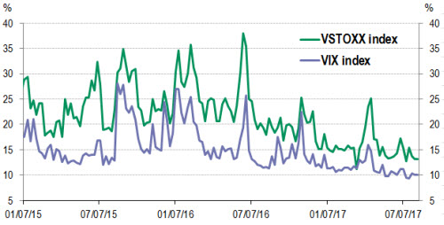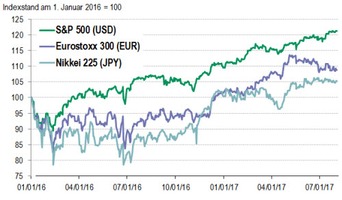 Die Volatilität an den Finanzmärkten ging im Juli abermals zurück. So sank beispielsweise der VIX, der die implizite Volatilität anhand der S&P 500-Optionen misst, auf ein Rekordtief von weniger als 9,5 %. Die jüngsten Wirtschaftsdaten zeichneten ein positives Bild, was die Einschätzung stützt, dass das globale Bruttoinlandsprodukt (BIP) 2017 und 2018 wieder um 3,5 % wachsen könnte. Zusätzlich wurden die Aktienmärkte durch eine positive Berichtssaison beflügelt.