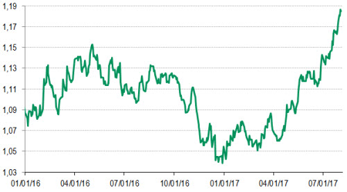 Trotz der Bemühungen der Europäische Zentralbank (EZB), die Kommentare des Präsidenten Mario Draghi von Ende Juni, die den Eurokurs in die Höhe getrieben hatten, wieder zu relativieren, wertete der Euro gegenüber dem US-Dollar im Juli weiter auf. So kletterte der Wechselkurs bis Monatsende auf etwas mehr als 1,18 und damit auf den höchsten Stand seit Anfang 2015. Damit hat die Gemeinschaftswährung seit Ende Juni um 3,5 % und seit Jahresbeginn um 11,9 % an Wert gewonnen.