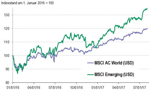 Der MSCI AC World Index legte im Juli um 2,7 % und seit Jahresbeginn um 13,2 % zu. Derweil kletterten die Aktien der Schwellenländer, gemessen am MSCI Emerging Markets Index, im Juli um 5,5 % und seit Jahresbeginn um 23,7 % nach oben (alle Angaben auf Dollarbasis). Beflügelt wurden die Schwellenländerbörsen – vor allem in Lateinamerika – dadurch, dass beim letzten Treffen der ölproduzierenden OPEC- und Nicht-OPEC-Länder die Vereinbarung zur Drosselung der Fördermenge bekräftigt wurde, was die Ölpreise nach oben trieb. So stieg der WTI-Preis im Juli um 9 % auf 50 US-Dollar pro Barrel an.