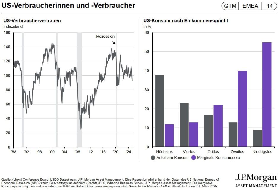 Laut Galler ist in den USA bereits ein Rückgang des Verbrauchervertrauens erkennbar. „Die Politik scheint bereit, durch ein Tal der Tränen zu gehen, weil sie überzeugt ist, dass am Ende ein langfristiger Nutzen entsteht. Beim Verbrauchervertrauen sehen wir jedoch bereits seit einigen Monaten eine stärker rückläufige Tendenz“, erklärt Galler. Auch unter Unternehmern gibt es eine zunehmende Besorgnis, nachdem die Stimmung unmittelbar nach der Wahl von US-Präsident Trump noch sehr positiv war. Besonders kleinere Unternehmen, die zunächst auf Steuersenkungen gehofft hatten, sind nun besorgt, dass der Handelskonflikt die Nachfrage nach Produkten und Dienstleistungen erheblich mindern könnte.