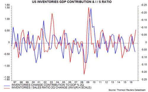 The blue line in the chart shows the contribution of the change in inventories to two-quarter GDP growth. The contribution was negative for five quarters ending in the third quarter of 2016, consistent with a cycle low having been reached in 2016.