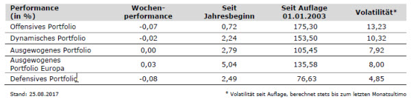 In der vergangenen Handelswoche legte das Private Wealth Portfolio um 11 Basispunkte zu. Spürbar positiv entwickelten sich dabei die Schwellenländer (MSCI EM +1,41%), während der US Dollar wieder deutlich an Wert gegenüber dem Euro einbüßte (-1,03%). Daher gehörten der Robeco QI Emerging Conservative Equities (+1,27%) und der OAKS Emerging and Frontier Opp (+0,91%) zu den größten Gewinnern im Portfolio. Auch der L/S-Aktienfonds Legg Mason MC Eurp Abs Alpha (+1,26%) profitierte von seiner Positionierung. Aufgrund des schwachen US Dollars kam der ungehedgte Nordea US Total Return Bond (-0,81%) erneut unter Druck. Auch der OYSTER European Selection (-0,75%) musste wegen seines Value sowie Small/Mid-Cap Fokus ebenfalls Verluste verkraften.