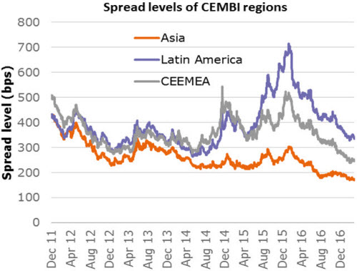 Quelle: JPMorgan, NN Investment Partners (Stand Ende März 2017), CEMBI steht für Corporate Emerging Markets Bond Index