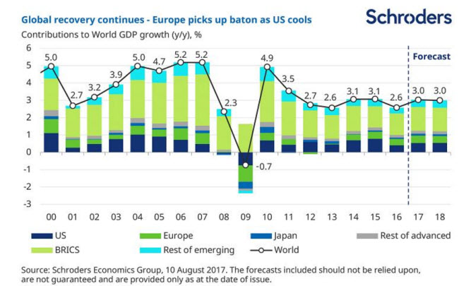 Looking into 2018, global growth is expected to remain stable at 3% with modest downgrades to the US, offset by upgrades to the eurozone and emerging markets.