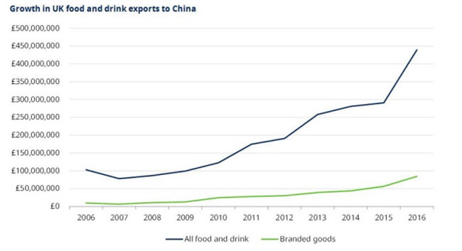 In 2016, tea exports from the UK to China rose by 63%, and milk powder exports increased by 134%. Cake exports climbed 26% and spring water leapt by 139%, according to the Food and Drink Federation.