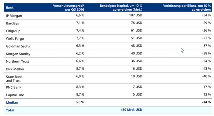 Zusätzlich enthält er Vorschläge hinsichtlich internationaler Bankenstandards, mit denen US-amerikanische und weltweite Bestimmungen zu Kapital- und Liquiditäts-standards aufeinander abgestimmt werden sollen. Davon profitieren dürften globale systemrelevante Institutionen, da die Standards der Bankenbehörden in den USA konservativer als die des Basler Ausschusses oder des Rats für Finanzstabilität sind.