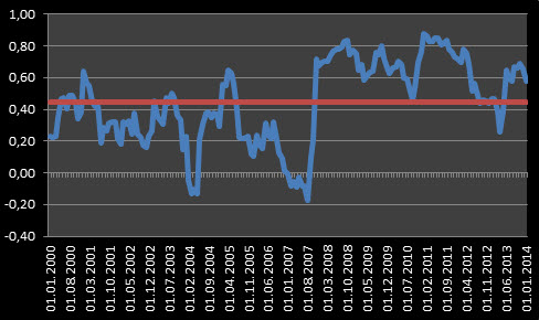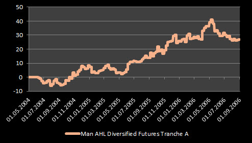 Im Gegensatz zu den bei Anlegern äußert gefragten „Unconstrained Bond Funds“, die ausnahmslos keinen Track Record in einem Zinserhöhungszyklus vorweisen können, haben CTAs diesen Lackmustest bereits bestanden. So bestätigt der folgende Chart, am Beispiel des Man AHL Diversified Futures, zwar die im Mittel signifikante Korrelation von trendfolgenden Ansätzen zum JPM GBI US Traded TR. Er zeigt aber auch, dass es sich hierbei um keine Einbahnstraße handelt und das Exposure durchaus flexibel gesteuert wurde. Dies gilt insbesondere für den letzten Zinserhöhungszyklus in den USA (Juni 2004 – Juni 2006).