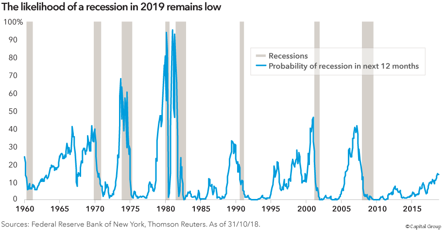 "We have not yet seen the excesses that would signal an imminent recession," says Capital Group economist Jared Franz. "I expect to see an economy that is still positive in 2019 but growing a bit slower, and the risk of recession will rise throughout the year."