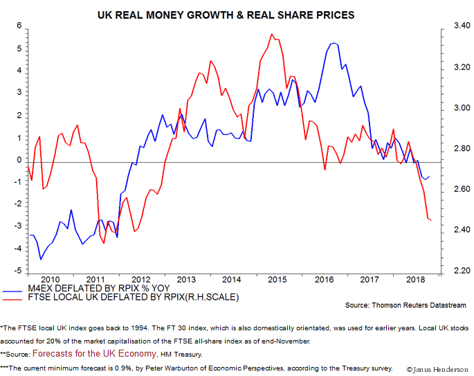 The rule gave a neutral message for 2018 at this time last year: real money growth had risen since December 2016 but real share prices had fallen. The current consensus estimate of 2018 GDP growth is 1.3%, below the 2.2% average for neutral years**. The undershoot could reflect a Brexit effect, or a fall in the economy’s potential growth rate.