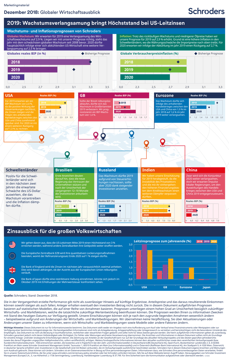 Die Weltwirtschaft zum Jahreswechsel: Wie werden sich die Weltwirtschaft und die Zinsen im Jahr 2019 entwickeln? Die Schroders-Meinung aufbereitet in einer übersichtlichen Infografik.