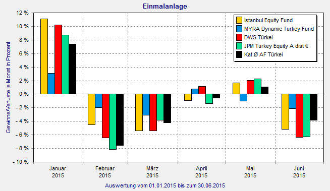 Dass der türkische Aktienmarkt volatil ist, ist keine Neuigkeit. In regelmäßigen Wechseln ist die Aktienfonds-Peergroup des Landes am Jahresende eine der weltweit besten oder eine der schlechtesten. Nach einem Plus von 36,3 Prozent im vergangenen Jahr, müsste es 2015 wieder stark nach unten gehen. Und genau das deutet sich bereits an. Nach dem ersten halben Jahr ist die Kategorie „Aktienfonds Türkei“ des FINANZEN FundAnalyzer (FVBS) mit einem Minus von 8,1 Prozent die am schlechtesten performende Peergroup.