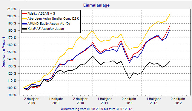 Spitzenreiter der Peer-Group im Zeitraum der vergangenen drei Jahre ist der Aberdeen Asian Smaller Companies Fund (ISIN: LU0231459958) von Aberdeen Global. Das Management Team von Aberdeen kommt im laufenden Jahr auf einen Wertzuwachs von 24,17 Prozent für den 1,62 Milliarden Euro starken Fonds. Für die vergangenen drei Jahre steht ein Plus beachtlichen 103,45 Prozent. Mit einer Volatilität von 12,76 Prozent erreicht der Fonds einen der besten Werte der Peer-Group. Die Sharpe Ratio von 1,99 ist von keinem anderen Fonds zu schlagen. Die Länderallokation zeigt eine breitere Diversifikation als bei den anderen beiden Fonds. Malaysia ist mit 17,4 Prozent am stärksten vertreten, gefolgt von Hongkong mit 16 Prozent. Singapur und Thailand rangieren mit 15,9 bzw. 12,4 Prozent dahinter (Stand: 31. Juli 2012).